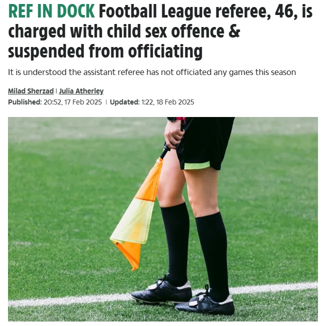 2月18日讯 《太阳报》报道,一位曾担任英格兰足球联赛(EFL,负责英冠、英甲、英乙)和足总杯比赛助理裁判的男子将因涉嫌儿童性犯罪出庭受审。